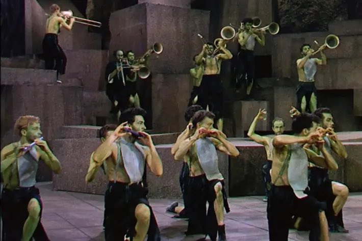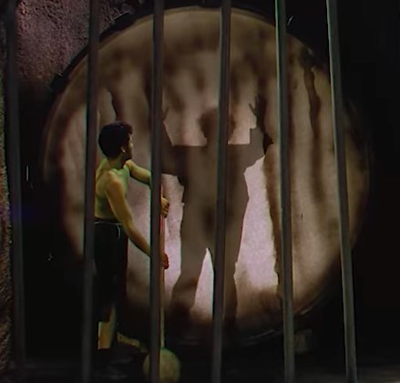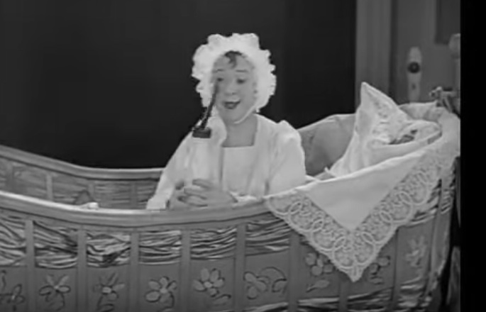A full-grown Harry Langdon, frolicking in a bassinet with a baby bonnet on his head. Gumming a teddy bear and a ball, then suckling on a baby bottle with a long tube that evokes an enema bottle. This is stylistically jarring, seems tacked on. Langdon frees his id, and thumbs his nose at Capra’s pieties.